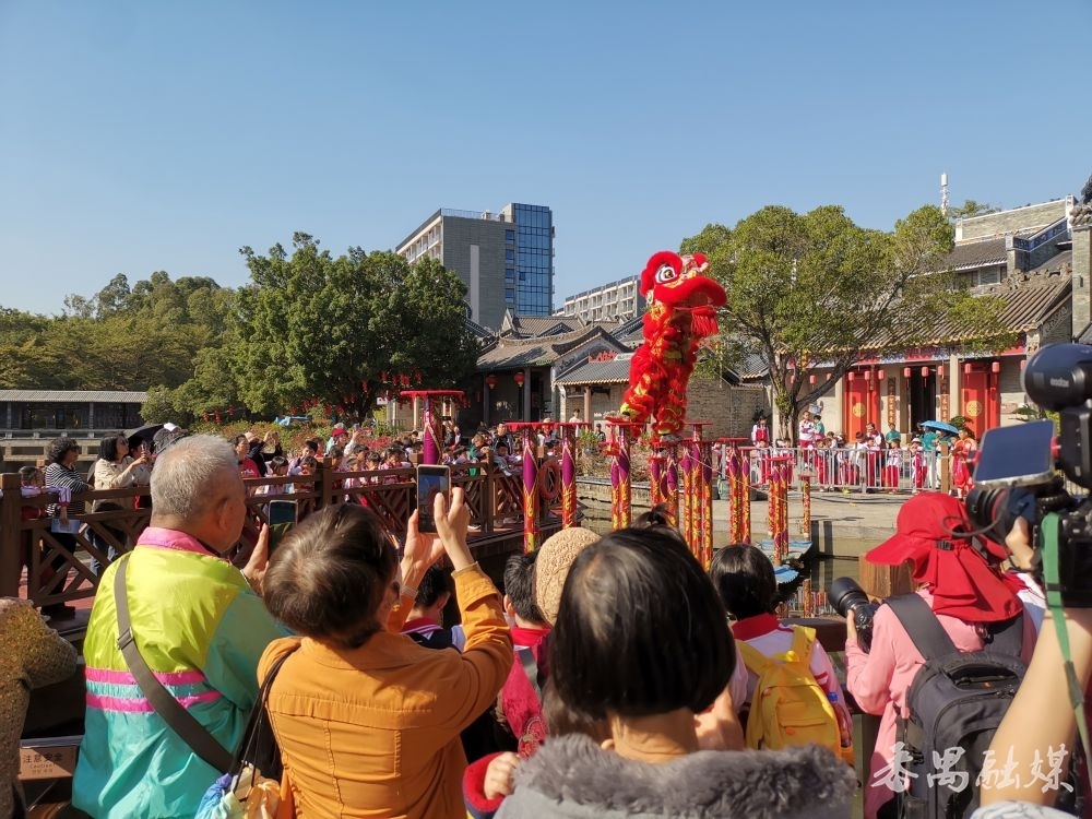 在岭南印象园中的龙舟广场上,锣鼓喧天中,醒狮在木桩上腾挪闪跃,引得观众阵阵喝彩。学员们纷纷寻找最佳机位,或蹲或站,专注地抓拍每一个威武矫健的瞬间。
